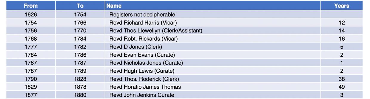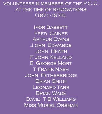 The restoration work was undertaken by the Rev. Canon and Rural Dean A.J.D. Williams (Vicar), Curate at the time was Rev. Edward John Evans.